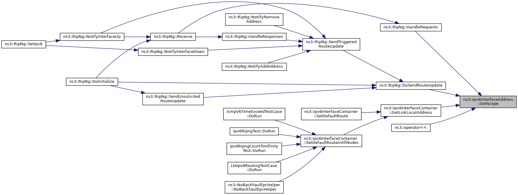 Here is the caller graph for this function:| Ipv6InterfaceAddress::Scope_e ns3::Ipv6InterfaceAddress::GetScope | ( | void | ) | const |